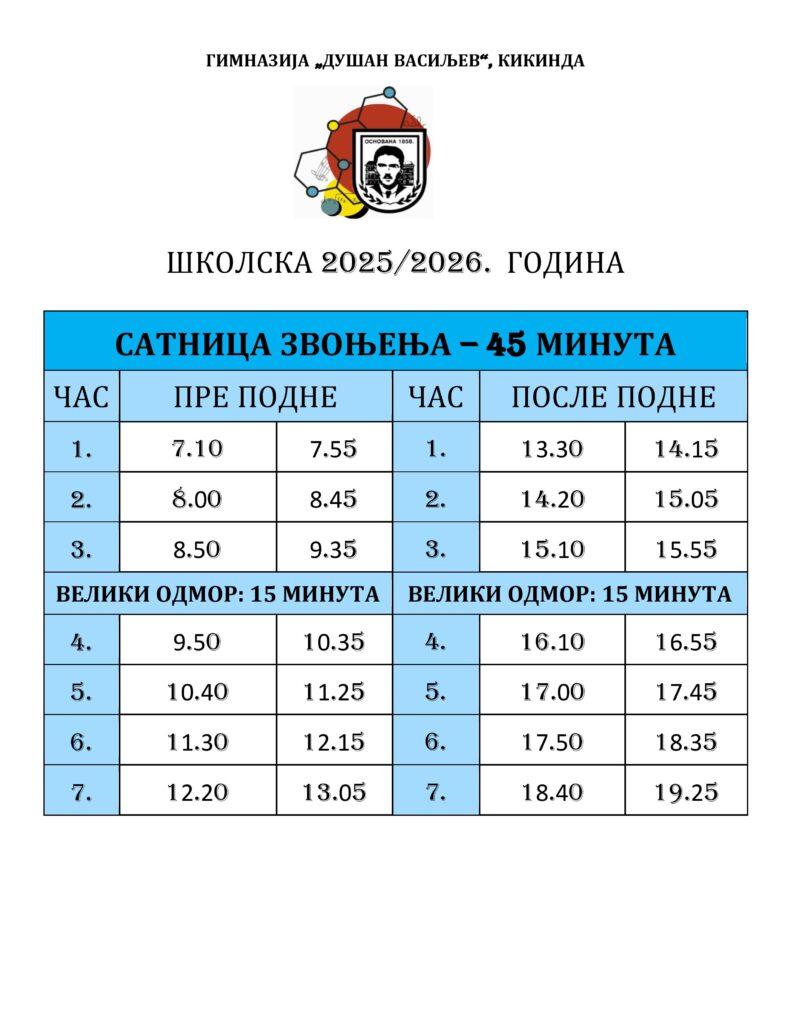 Распоред часова по одељењима