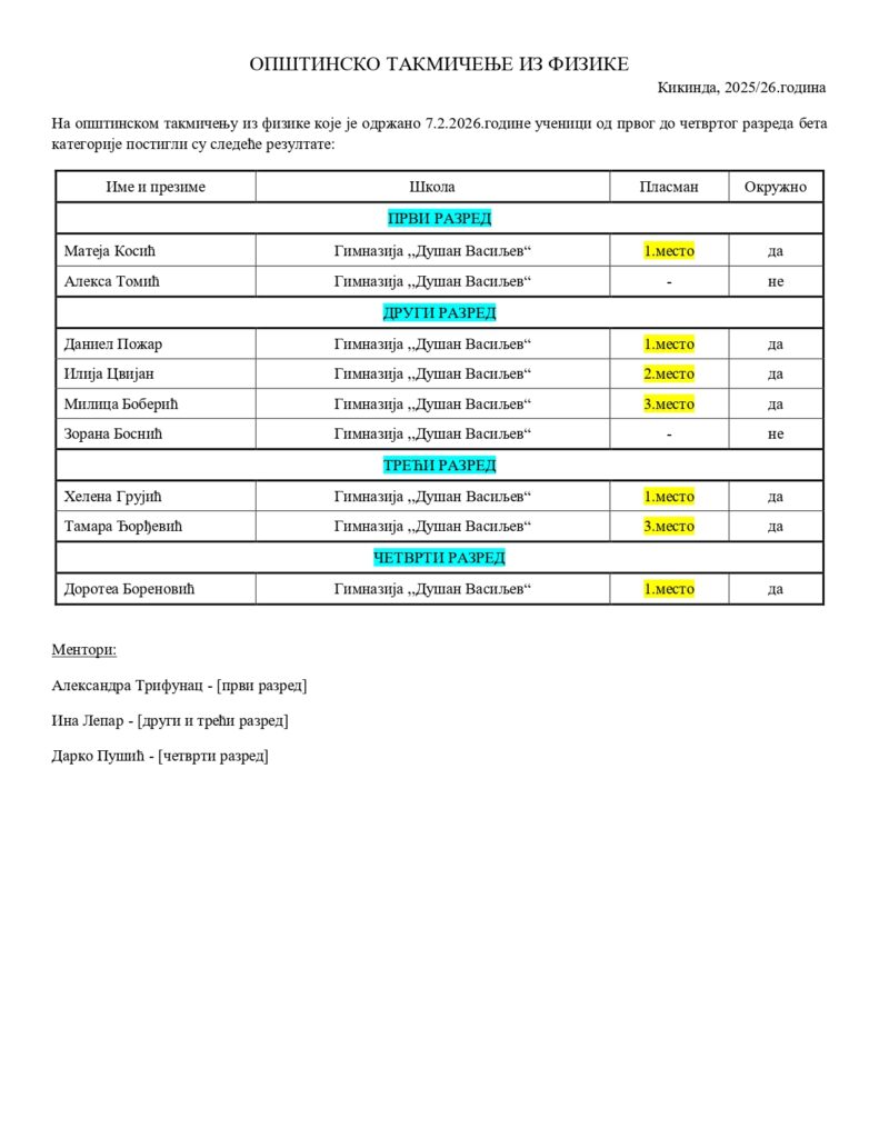 Резултати школског такмичења из Енглеског језика